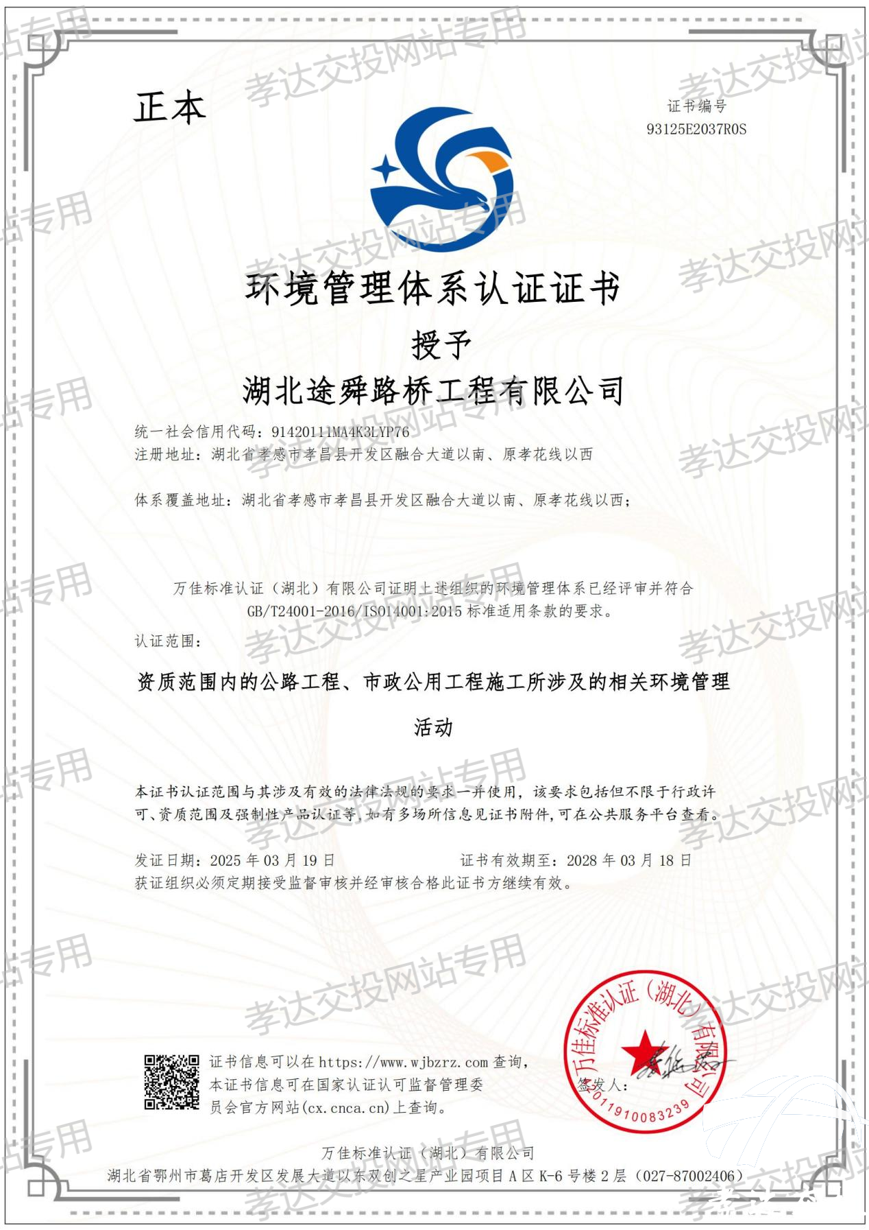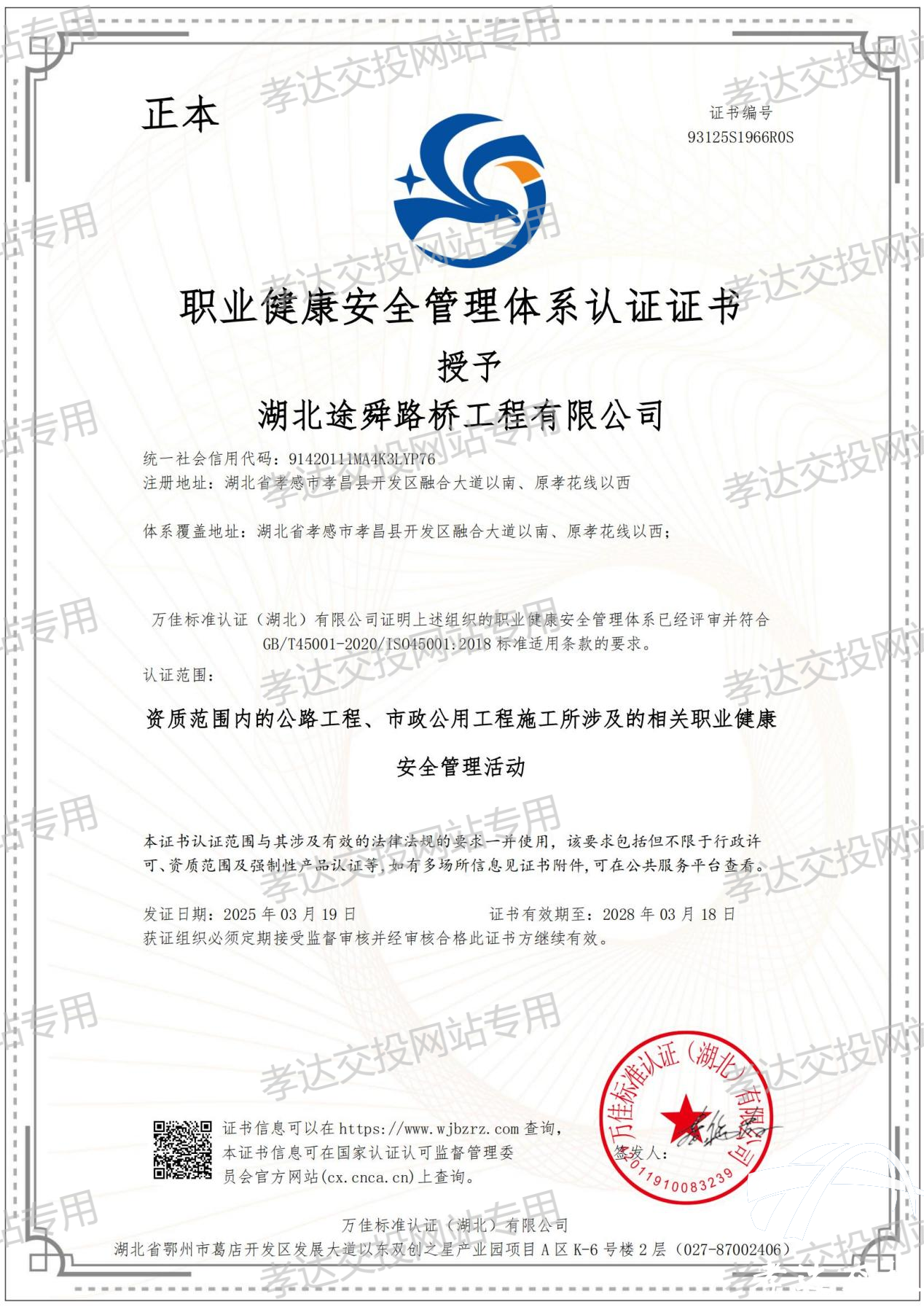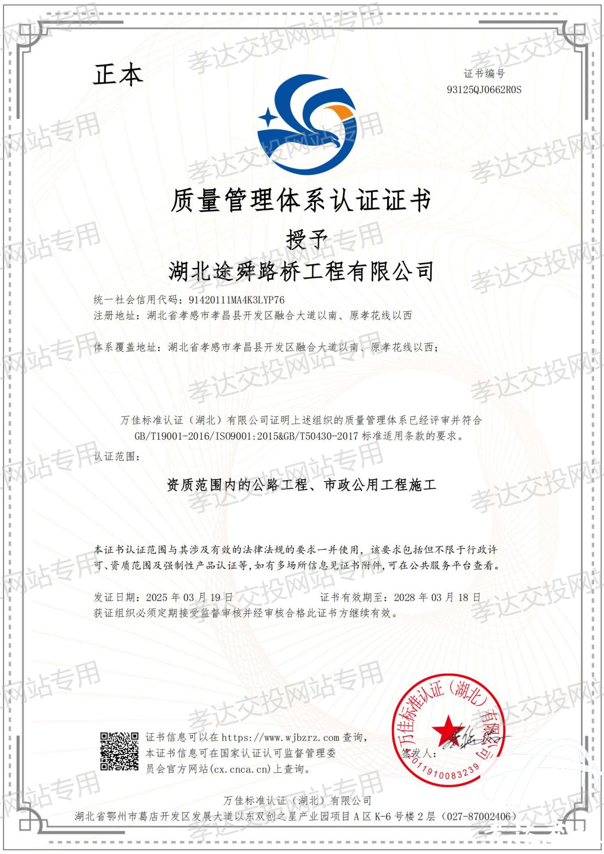 3月19日,孝達交投全資子公司——湖北途舜路橋工程有限公司,在順利通過中國質(zhì)量認證中心萬佳標準認證中心《質(zhì)量、環(huán)境和職業(yè)健康安全管理》三標體系認證審核后,取得三標管理體系認證證書。